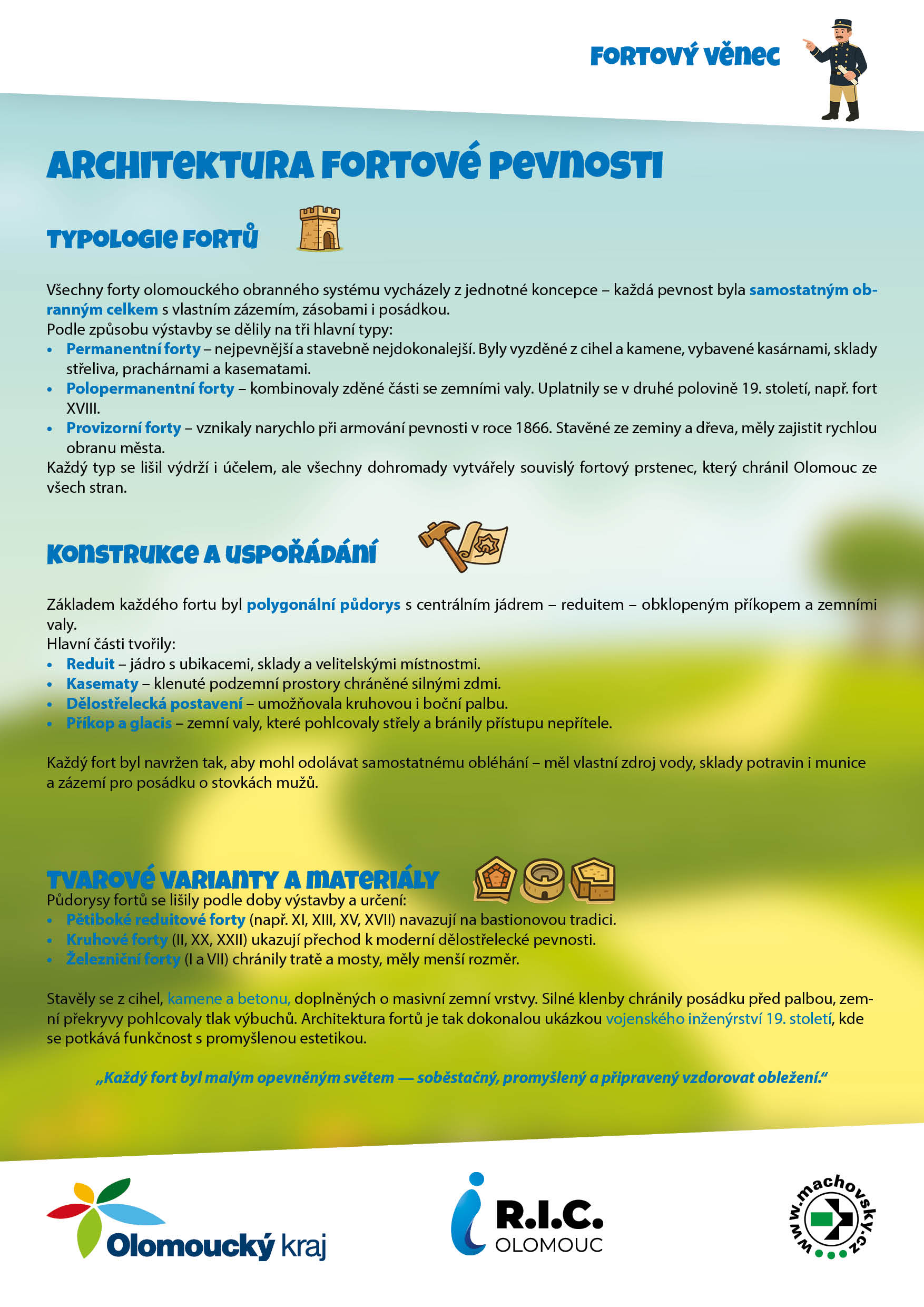 V okruhu přibližně deseti kilometrů vzniklo 22 fortů – samostatných pevnostních objektů, které se navzájem kryly palbou a společně tvořily téměř neproniknutelný prstenec kolem města. Každý fort měl vlastní kasematy, dělostřelecké rampy, sklady i ubikace pro vojáky. Olomouc se tak stala jednou z nejmodernějších pevností habsburské monarchie.